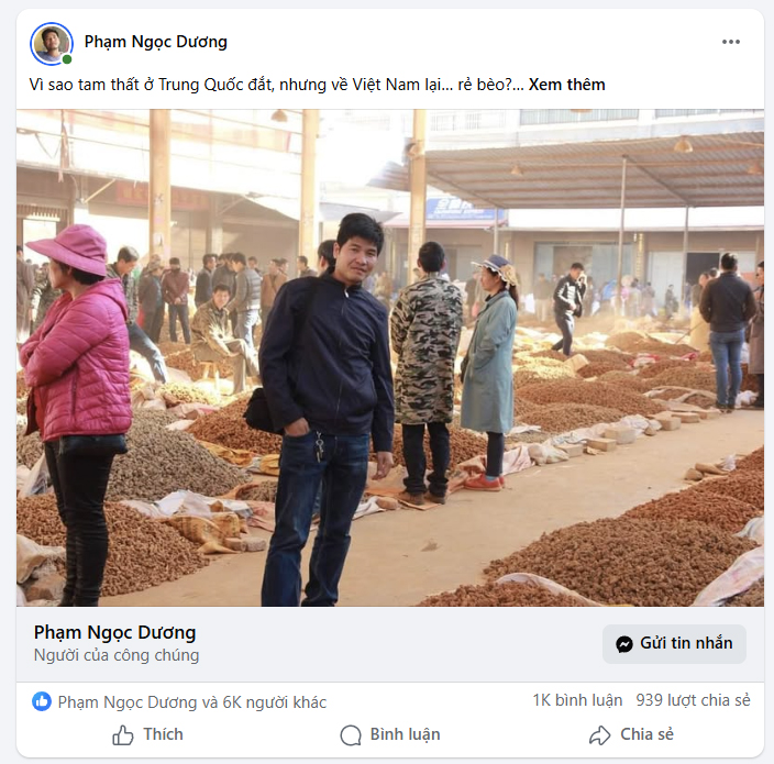 Về Việt Nam thì bao nhiêu chi phí bốc vác, bê lậu, hải quan, đầu mối buôn lớn, buôn nhỏ, thì đến tay người tiêu dùng nó phải 4-5 triệu đồng cho loại rẻ, chứ chưa nói loại đắt. Riêng lại cao cấp của Trung Quốc không thấy có ở Việt Nam. Tôi nghĩ không phải vì người Việt không có tiền mua tam thất cao cấp, vì đông trùng hạ thảo vài tỉ còn mua được mà. Là vì, Trung Quốc họ phân chia thị trường theo quy trình rồi.