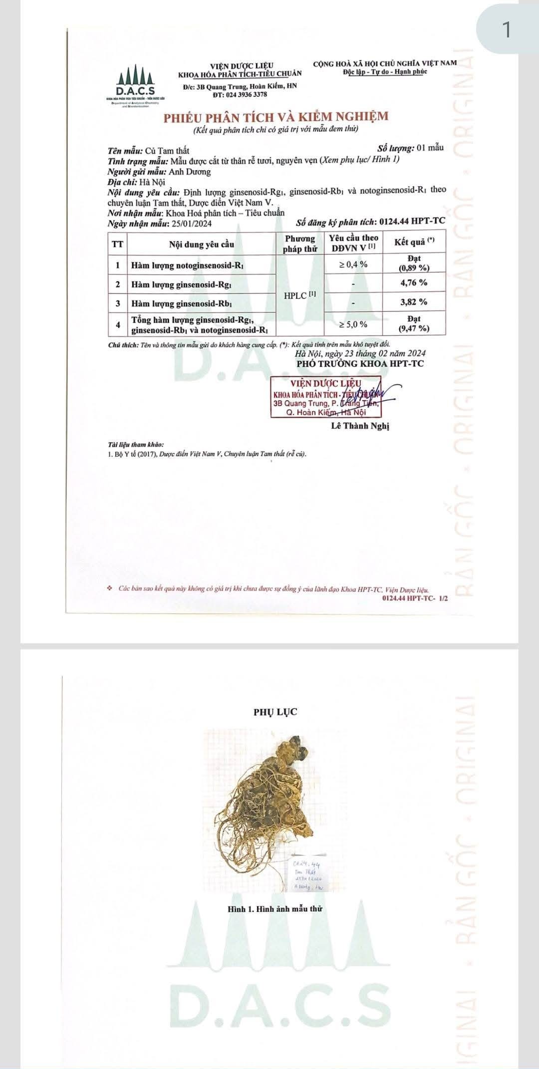 Ảnh: So sánh định lượng Saponin của củ tam thất và củ sâm Lai Châu đều 6 năm tuổi, thì thấy saponin rg1 của sâm là 4,55%, còn củ tam thất là 4,76%. Rb1 của củ tam thất là 3,82%. Củ sâm tôi ko làm rb1 vì tôi biết nó thường 1-2% thôi. Các saponin quan trọng nhất là rg1 và rb1 của nhân sâm (Hàn và TQ) đều cực kỳ cao trong củ tam thất 6 tuổi. Tuy nhiên, hàm lượng tổng ko bằng sâm Việt Nam dc vì tam thất ko có saponin mr2, trong khi mr2 của sâm Lai Châu lại cao vút, tới 7,54%. Ngoài ra, sâm Lai Châu, Ngọc Linh có tới 82 loại saponin thì chả có sâm nào so được.